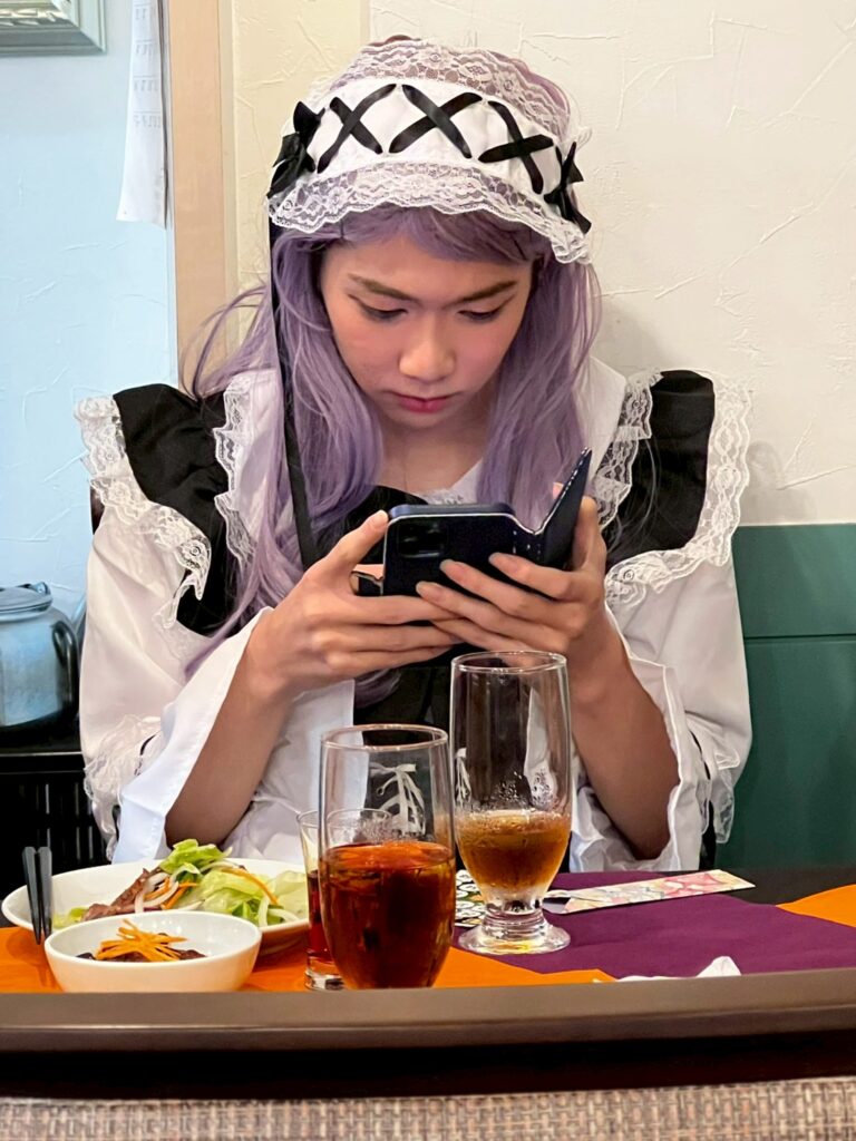 店を出ても飽き足らず、入口や周辺で撮影を続けました。昔懐かし「シェー」をキメるつもりが若干ふらつき、何度かやり直します。バランスの良いポーズを厳選していると、50メートルほど先で、何やら数名の人がこちらを見ています。周りは田畑や道路で油断していましたが、由緒ある料亭の前でシェーポーズは、どう見ても怪しいですね。